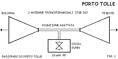 A Porto Tolle (vedi fig. 1), quasi al centro della tratta in esame, su una torre piezometrica alta circa 25 metri, è stato installato un oscillatore in guida d’onda a diodo Gunn, di 20 mW di potenza d’uscita, che alimenta, tramite un divisore a T, due antenne troncopiramidali calibrate per un guadagno isotropico di 27 dB, puntate nelle direzioni diametralmente opposte, di Bologna e Trieste.