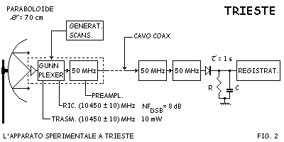 A Trieste (fig. 2), ad un’altezza di circa 40 m sul livello del mare, un paraboloide di 70 cm di diametro trova nel suo fuoco un mixer-trasmettitore (Gunnplexer) costituito da un circolatore, da un diodo Schottky e da una cavità contenente un oscillatore a diodo Gunn sintonizzato mediante un varactor per +/- 10 MHz. Il ricevitore ed il trasmettitore, con 8 dB di cifra di rumore (DSB) e 10 mW di potenza di uscita, possono così esplorare contemporaneamente una banda di 20 MHz. Il segnale ricevuto, convertito a media frequenza (50 MHz), amplificato, rivelato ed integrato (t = 1 s), pilota un registratore a penna scrivente.