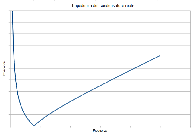 Come si è visto il condensatore reale ha un comportamento molto diverso da quello ideale. L'impedenza non è sempre decrescente come ci si aspetterebbe da un condensatore ideale ma diminuisce fino a raggiungere un valore minimo e poi risale di nuovo.