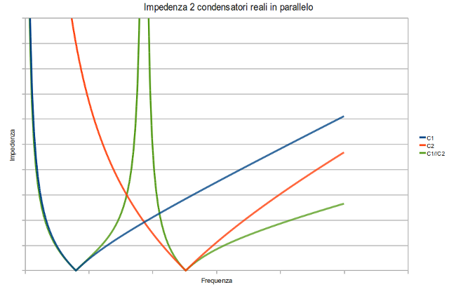 Nell'immagine qui sotto sono mostrati 3 grafici. Quello arancione rappresenta l'impedenza di un condensatore di capacità inferiore a quello blu. In verde è mostrato il parallelo tra le due.