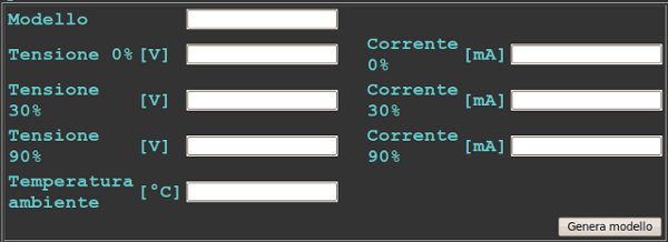 Si inseriscono i valori di tensione, corrente e temperatura e premendo il pulsante "Genera modello" si ottiene il modello SPICE del diodo.