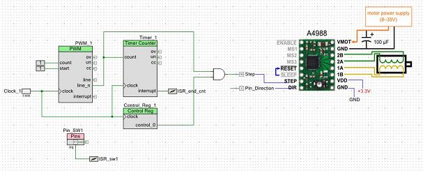 Questo progettino si prefigge di pilotare un driver per motori stepper tipo EasyDriver ed in questo caso Pololu A4988. Ho cercato in rete ma non ho trovato nulla di simile per il PSoC. Quindi sono partito da zero. Probabilmente ci sarà qualche soluzione migliore da quella implememtata da me!