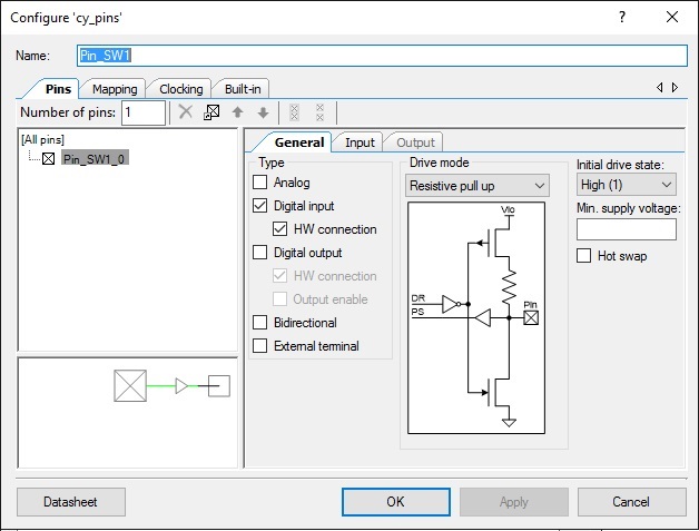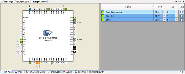 Con il tool per la gestione dei pin si assegna a Pin_SW1 la porta P0.7 che corrisponde allo switch presente sul kit. Al pin “Step” ho vuluto assegnare la porta P1.6 che corrisponde al led del kit in modo che possa fungere da monitor. Il Pin_Direction è stato assegnato automaticamente dal tool alla porta P0.0 e non l’ho modificato.