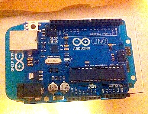 prodotta da ATmel) che comada dei pin connessi alle porte I/O,nell'ARDUINO UNO avremo 14 pin I/O digitali e 6 pin di input analogici.Inoltre è fornito di un regolatore di tensione, per una alimentazione da 5 a 12 v ma che può essere alimentato anche da un'interfaccia USB che a sua volta permette la comunicazione con il computer.