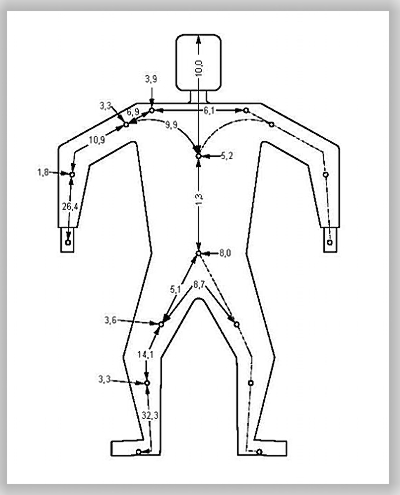 La seguente figura rappresenta il corpo umano come un insieme di impedenze, nel caso di attraversamento mano-piede. I numeri rappresentano la percentuale dell'impedenza presentata da quella parte del corpo