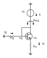Partendo dal punto indicato nel disegno, vedo due rami in parallelo: uno che porta al gate e l'altro che porta nel drain del transistore. Poichè da quello che porta al gate vedo un resistenza pari a Rg per quanto detto sopra, e poiché abbiamo dimostrato che la resistenza equivalente è , ne consegue che dall'altro ramo del parallelo, cioè quello che entra nel drain, devo necessariamente vedere [Formula]. Quindi nella configurazione transdiodo è come se dal drain vedessi verso il source, dal quale a sua volta vedo Rs in serie verso massa.