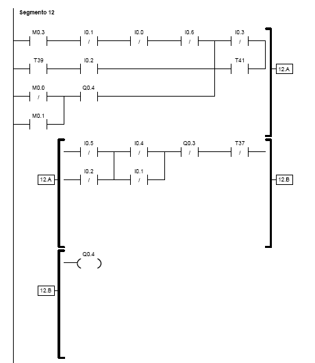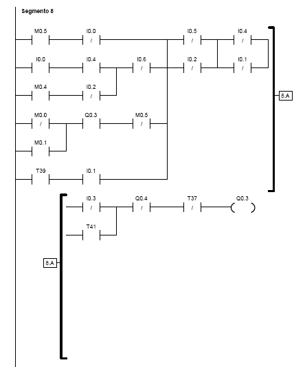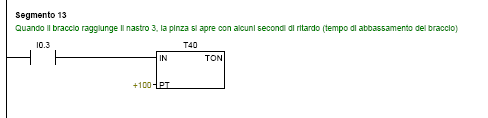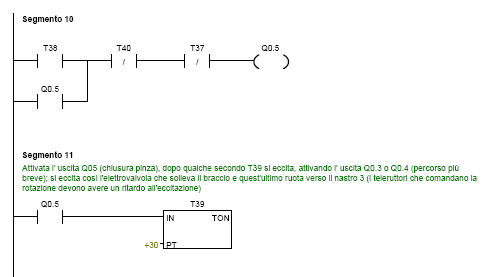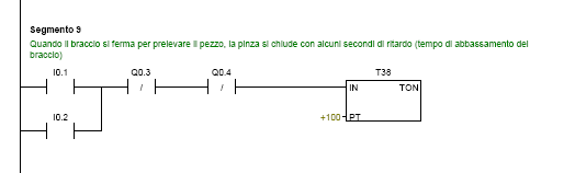 Raggiunto il nastro 1 o 2 il braccio si ferma e si abbassa; con alcuni secondi di ritardo (T38) si attiva l' uscita Q0.5, che comanda la pinza pneumatica di presa del pezzo. Dopo un istante (T39) si attiva l' uscita Q0.4 o Q0.3: di conseguenza il braccio si solleva e ruota in senso orario o antiorario (percorso più breve) fino a raggiungere il nastro 3. Con alcuni secondi di ritardo (T40) si disattiva l' uscita Q0.5 e la pinza si apre. Dopo un istante (T41) si attiva l' uscita Q0.3 o Q0.4 ed il braccio si sposta verso il nastro 1 o 2 per prelevare un altro pezzo (ha la priorità il pezzo che viene rilevato per primo dalla relativa fotocellula).