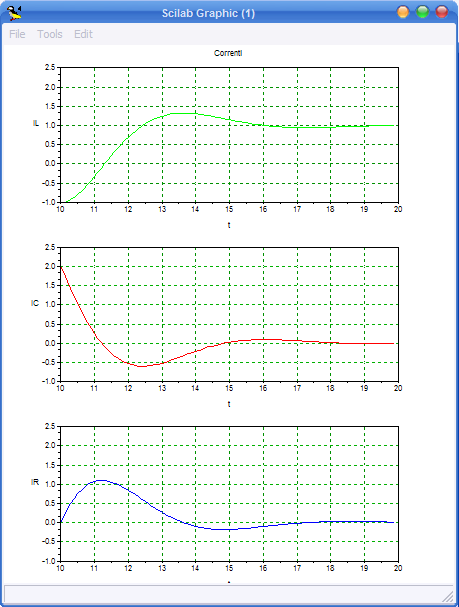Per la visualizzazione grafica finale usiamo un plot2d e Maxima attraverso Gnuplot ci dara' il seguente grafico; si nota, a conferma della soluzione, come la somma delle tre correnti sia sempre pari a 1 ampere.