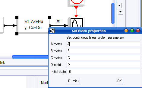 e quindi in Scicos potremo fare riferimento alle matrici A,B,C,D e x0 per costruire il blocco rappresentativo il sistema