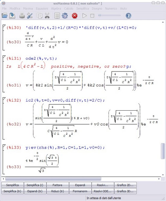 Maxima a questo punto, non avendo ancora assegnato i valori numerici di R, L e C, richiede per proseguire, l'input del segno di