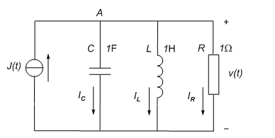 A questo punto (%i34), particolarizziamo v(t) fissando le costanti del circuito: R=1, L=1, C=1, V0=0 ottenendo la (%o34), che rappresenta sia la tensione v(t) sul parallelo sia la corrente IR(t).
