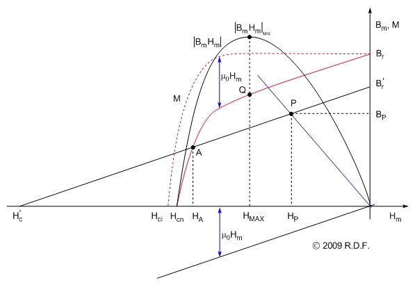 Nell'esempio di figura è stata invece ipotizzata una forte smagnetizzazione del magnete, tale da portare il punto di lavoro in A; in questa situazione, una successiva riduzione del campo smagnetizzante, fa percorrere al punto di lavoro un ciclo parziale, approssimabile con una retta che, passante per A e parallela alla tangente alla curva di smagnetizzazione in Br, intersechi l'asse B in corrispondenza ad una induzione residua Br' inferiore alla Br nominale.
