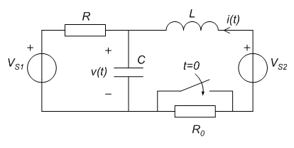 Esercizio 2- Nel circuito di figura, alimentato da molto tempo dalle due sorgenti di tensione costante, si determini, l'espressione analitica della tensione v(t) sul condensatore e della corrente i(t) nell'induttore, in seguito alla chiusura dell'interruttore al tempo t=0, mediante il metodo delle equazioni di stato nel dominio di Laplace.