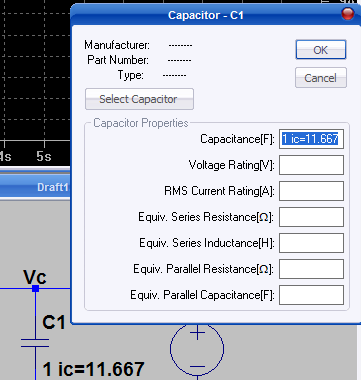 e imponiamo le condizioni iniziali nel condensatore, aggiungendo al valore della capacità un ic=v(0-), nel nostro caso ic=11.667, nella finestra d'inserimento