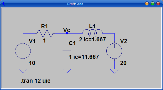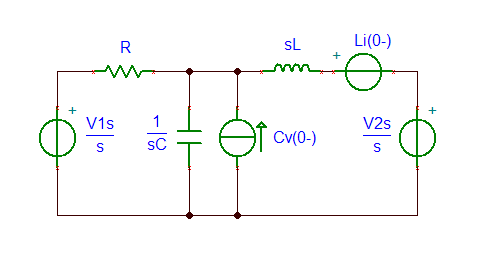 Notiamo come le condizioni iniziali siano implementate con due generatori fittizi, in parallelo con il condensatore ed in serie con l'induttore.