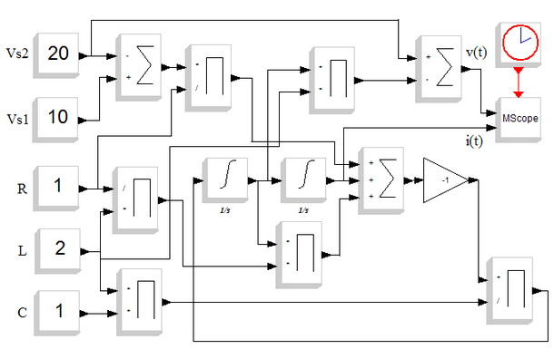 (si notino nei blocchi 1/s gli inserimenti delle condizioni iniziali IC); si concluderà ancora con il riferimento a questo blocco sull'estrema destra, chiudendo l'anello.