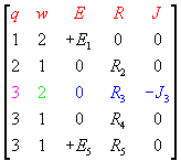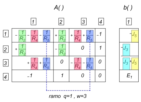 Riprendendo il sistema iniziale, a 4 equazioni (non indipendenti ) e 4 incognite, scritta la matrice dei coefficienti e dei termini noti in forma letterale, incominciamo a considerare i rami con resistenza diversa da zero. Notiamo come il ramo con [q=1, w=3, R=R5] compaia negli elementi A(1,1) e A(3,3) con segno negativo mentre negli elementi A(1,3) e A(3,1) con segno positivo,