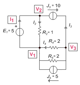 1) trasformare con Thevenin il blocco (E1,R2 e J3) in un semplice (Jeq=3), 2) applicare Millman e ricavare V31=(10-5)/(1/2+1/2)=5 V, 3) calcolare con Ohm I5=(V31+E5)/R5=15/2=7,5 A; I4=V31/R4=5/2=2,5 A; I2=E1/R2= 5/1=5 A; I3=-J3=-10 A e con Kirchhoff I1=I2-I3=5+10=15 A