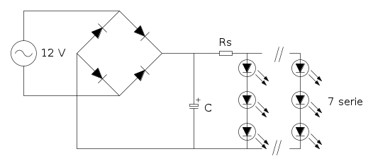 Rispetto alle classiche soluzioni con una Rs per ciascun ramo di LED questa soluzione è in generale molto meno affidabile, perchè non realizza un controllo (seppur grossolano) su ciascun ramo ma solo sulla corrente totale. Il motivo di tale scelta è doppio. Il motivo pratico è che, non avendo modo di caratterizzare in maniera semplice il toroidale con carichi variabili, ho dovuto procedere modificando (riducendo) progressivamente Rs fino ad ottenere la corrente totale media desiderata (pari a circa 50 x 7 = 350mA). Per inserire una Rs in ogni ramo avrei dovuto utilizzare una resistenza SMD da montare volante sulla striscia modificata,e quindi avrei dovuto modificare progressivamente le 7 resistenze.