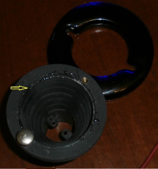 Questa volta ho smontato totalmente la parte superiore della lampada per eliminare il vecchio attacco G6 ed i suoi problemi di contatto. Ecco la foto della struttura conica che contiene il corpo illuminante.