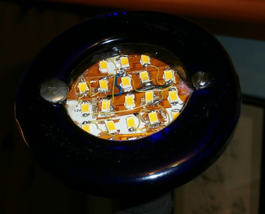 Per semplicità realizzativa e per migliorare il raffreddamento dei LED ho quindi deciso di sfruttare la sede circolare che ospitava la parabola (indicata in figura dalla freccia) e montare i LED su una lamina circolare in Cu-Be delle stesse dimensioni della sede. Poichè da misure precedenti avevo ottenuto Vcc=12-13V circa (a seconda del carico) dopo il solito ponte di diodi + condensatore, la configurazione possibile era di n serie da 3 LED ciascuna con opportuna Rs. In base alle posizioni dei LED sulla striscia è stato subito evidente che avrei dovuto modificare la striscia per aumentare il numero di LED e poter arrivare a montarne un numero compreso tra 12 e 21 LED (P=1,8-3,15W sui LED). In seguito alle prime prove è poi risultata evidente la necessità, per avere luce sufficiente, di montare tutti i 21 LED modificando drasticamente il layout della striscia: ho eliminato tutte le Rs presenti sulla striscia e sfruttato le rispettive piazzole per ulteriori LED, inoltre ho ricavato ulteriori piazzole raddoppiando la "densità" cioè il numero di LED/metro. Il risultato finale, non proprio bellissimo a vedersi ma incassato nella lampada, è visibile nella foto.
