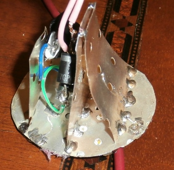 Questo aumento notevole del calore da smaltire potrebbe ridurre la durata nel tempo dei LED. Ho quindi realizzato con la stessa lamina, sul retro del circuito, delle rudimentali alette tra le quali ha trovato spazio il ponte di diodi, il condensatore di livellamento e la resistenza serie.