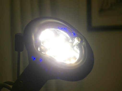 Qualche anno fa avevo fatto la prima modifica con LED simili a quello usato per la lampadina da libro; il risultato non era stato soddisfacente a causa della scarsa affidabilità termica di quei diodi e del montaggio in gruppo con circolazione d'aria limitata: dopo solo pochi mesi alcuni LED sono passati "a miglior vita"... Avevo poi modificato il tutto utilizzando ancora LED da 8mm 140° ma soli 100 mA (0,3W cadauno circa). Lo spazio disponibile mi ha permesso di montare 3 serie di 4 LED, con una Rs minima per ogni ramo e una potenza totale sui LED di circa 4W. La resa luminosa non era eccezionale, anche a causa della scarsità di luce laterale (il cono di emissione reale sembrava inferiore a 140°).L'affidabilità era sufficiente, ma il contatto col supporto ceramico era ormai compromesso e causava difficoltà di accensione.