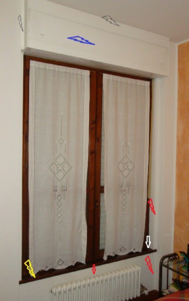 Su tutta la parete sottofinestra, più sottile, è stato realizzato un "mini" cappotto interno con pannelli di polistirene preaccoppiato a cartongesso.Quindi la parete, che prima finiva in corrispondenza della freccia bianca, ora viene più avanti (fulmine rosso); questo intervento procura un risparmio limitato (meno del 2%) a causa della piccola estensione di tali pareti.L'altro fulmine rosso indica analogo 'microcappotto' fatto sullo stesso piano per ricoprire il muro sottile che corre intorno all'infisso, tipico ponte termico frequentemente sede di muffa.