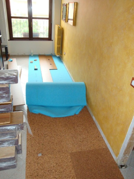 Abbiamo deciso in particolare di posare un parquet flottante in tutta la casa, ricoprendo gli originali pavimenti in ceramica e il parquet già presente nelle camere da letto. Avendo alle spalle ben 5 anni di chiusura del negozio sottostante, con leggero aumento delle spese di riscaldamento, ho deciso inoltre di effettuare la posa del parquet in autonomia e, contro tutti i pareri degli specialisti del settore, ponendo sotto il parquet oltre il solito tappetino pannelli di sughero di spessore pari a 1cm per ottenere un ulteriore isolamento termico.