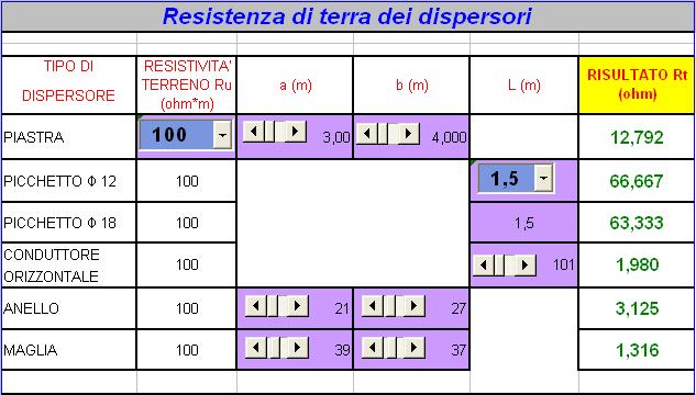 Nel secondo foglio, con la stessa procedura si può determinare la resistenza offerta dai dispersori di varia forma e dimensioni, dispersori a picchetto, dispersori a piastra, dispersori ad anello, dispersori a maglia.