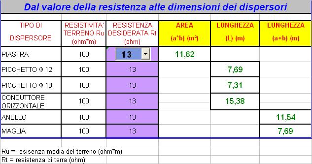 Si riporta anche una tabella che consente di effettuare il processo inverso, entrando con il valore di resistenza che si vuole ottenere, il programma fornisce le dimensioni minime necessarie per i vari tipi di dispersori.