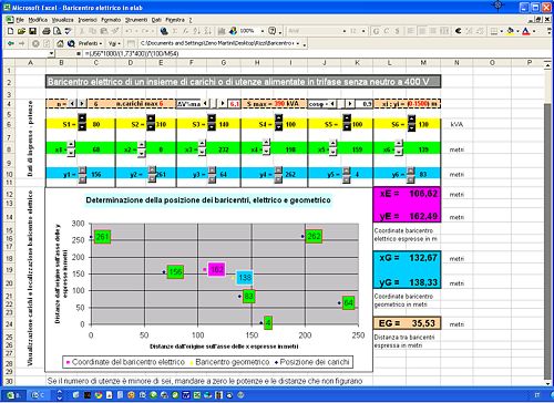 Calcola le coordinate del baricentro elettrico e di quello geometrico di un insieme di utenze, a partire dal valore della potenza attiva di ogni carico, realizza il dimensionamento di tutti i cavi e controlla la caduta di tensione percentuale.