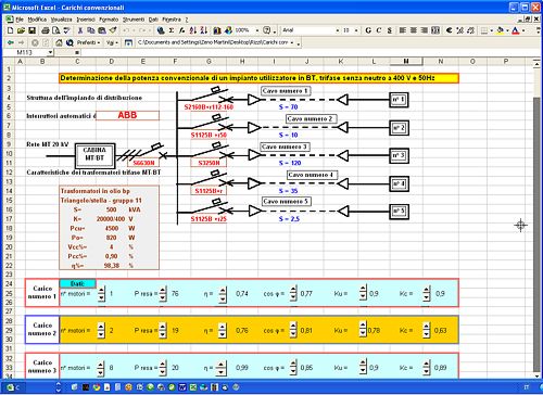 Determinazione del carico convenzionale per un insieme di utenze alimentate da un trasformatore, realizza il dimensionamento di tutti i componenti il sistema, trasformatore, interruttori, cavi.