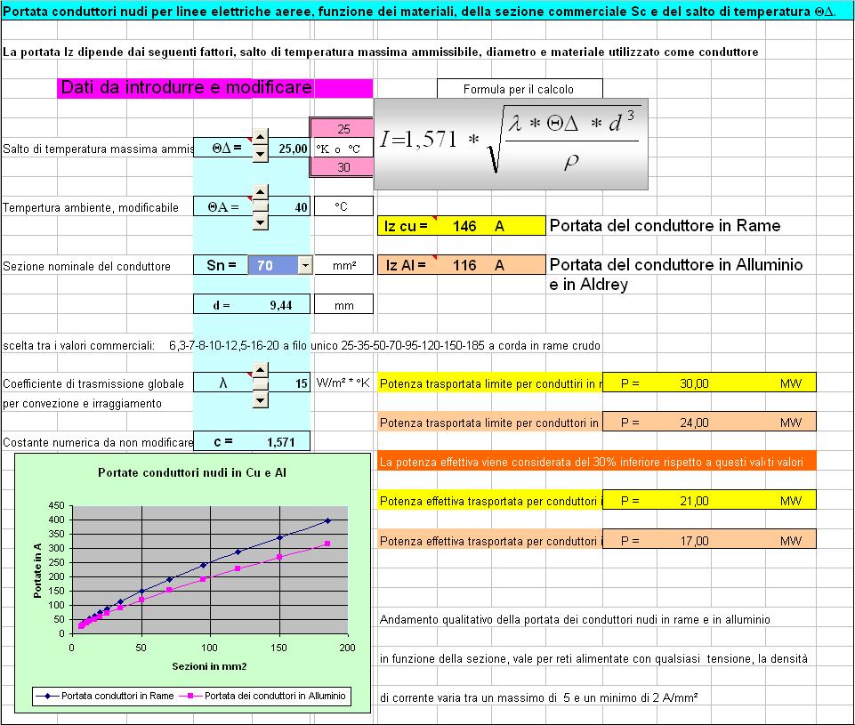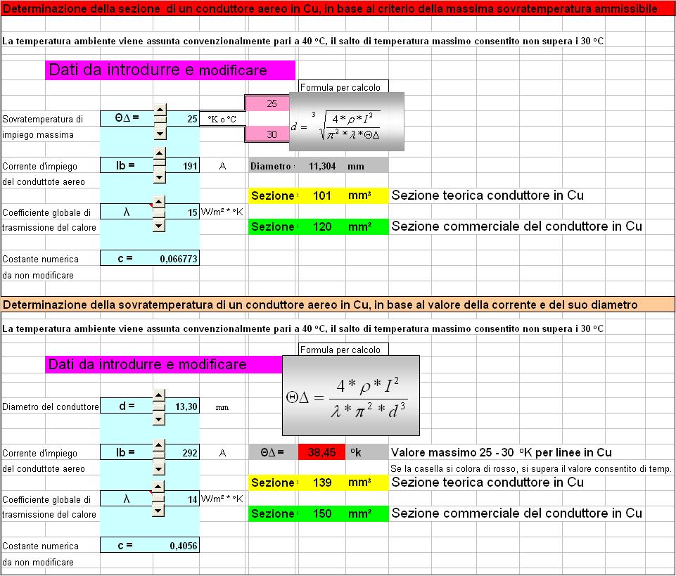 Verifica alla sovratemperatura dei conduttori utilizzati La verifica viene condotta utilizzando la relazione di equilibrio termico tra energia prodotta per effetto Joule ed energia trasmessa all'ambiente circostante il conduttore, vengono proposte anche le formule inverse, per un analisi completa del fenomeno.
