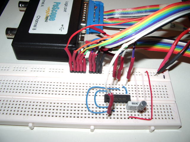 La porta logica NOT ha la caratteristica di invertire il segnale in ingresso, ma lo fa con un certo ritardo che dipende dalle tecniche costruttive. Esaminando il DataSheet dell'integrato 74LS04, nella sezione Switching Characteristics, vi troviamo il Propagation Delay Time tPLH o tPHL variabile tra 4 e 15 ns: decisamente rapido, troppo rapido per le nostre capacità cognitive (mi riferisco al PoScope). Proviamo, allora, con una porta NOT in tecnologia CMOS (complementary metal-oxide semiconductor), per esempio la CD4009 o la CD4049 o, ancora, la CD4069 tutte con tempi di propagazione intorno ai 150 ns se alimentate a 5 V. Se ne mettiamo 7 in serie possiamo aumentare il periodo a 2 x 150 x 7 = 2100 ns che, con l'analizzatore logico, dovremmo poter intercettare: proviamo!
