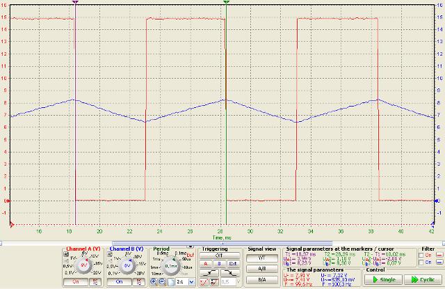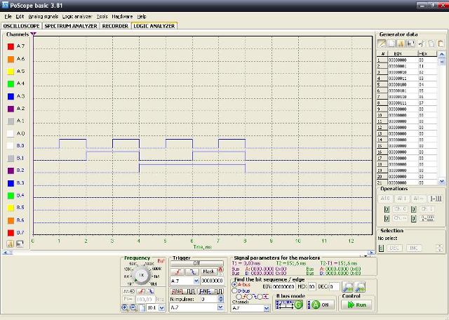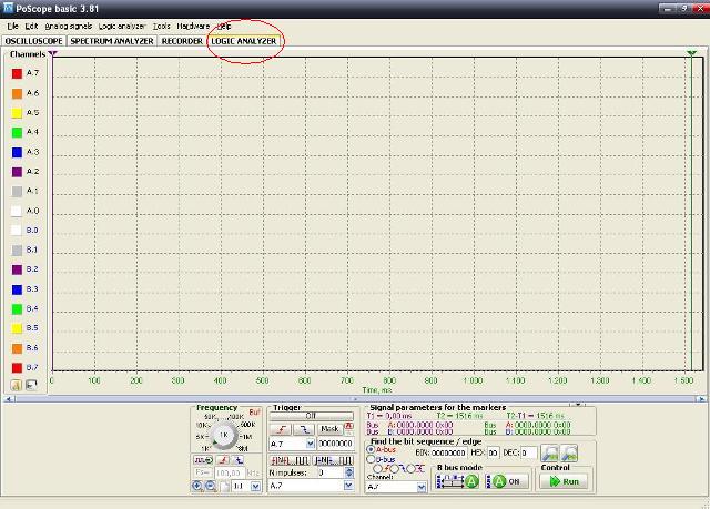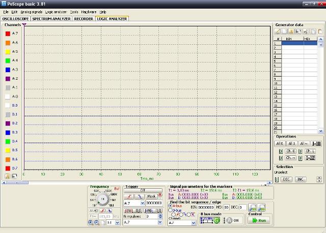 I restanti cavetti del canale B non utilizzati li possiamo lasciare sconnessi, mentre conviene porre a massa quelli che avanzano del canale A per evitare false tracce sul video. Prima di dare corrente alla BreadBoard, prepariamo il generatore di segnale del PoScope: connettiamo il Poscope al PC con l'apposito cavo USB e lanciamo il suo software che apparirà così: