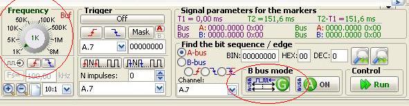 In basso, al centro, vi è il pulsante di selezione del canale B impostato per default come ingresso, selezioniamolo come generatore ed impostiamo la frequenza su 1 kHz come qui evidenziato: