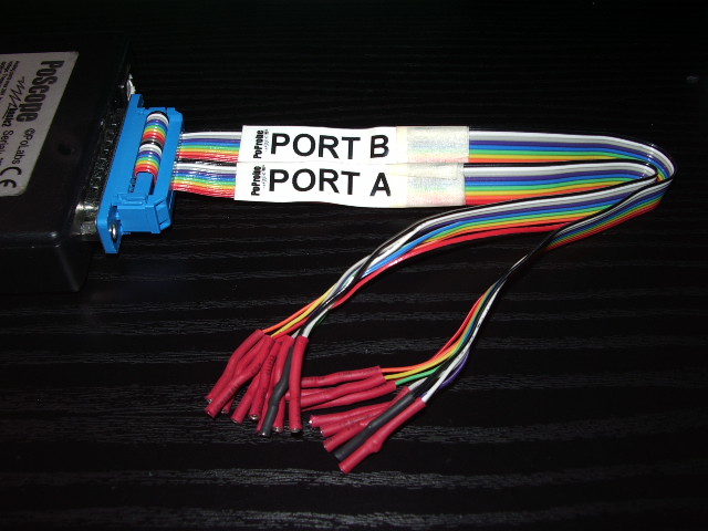 Notiamo la presenza di 2 canali A e B con 9 cavetti ognuno: 8 di segnale ed 1 di massa. Il canale A viene usato per la rilevazione delle uscite mentre il canale B è usato per generare gli ingressi. Per innestare le boccole sulla BreadBoard occorrono degli spinotti oppure degli spezzoni di filo rigido:
