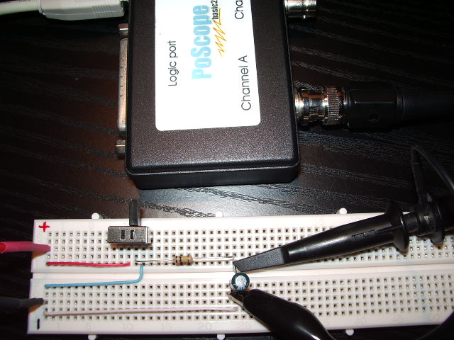 Realizziamolo su BreadBoard scegliendo una R da 100 kΩ ed un C da 10 µF in modo da avere tempi di carica e scarica rilevabili col PoScope: