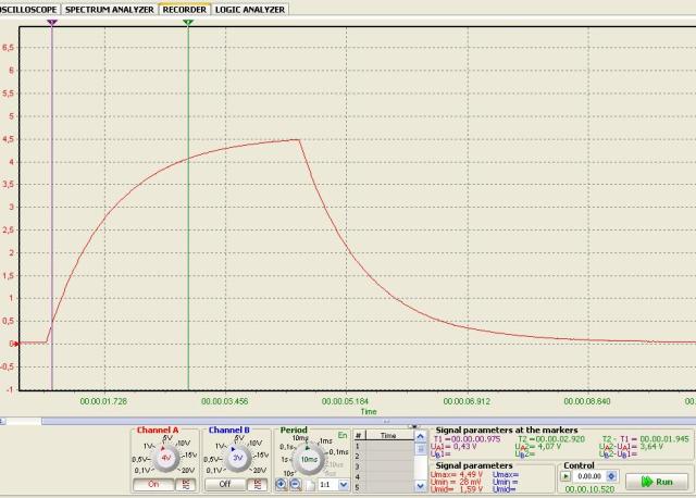 Colleghiamo l'oscilloscopio agli estremi del condensatore e vediamo che succede azionando il deviatore tra + e - per alimentare (5V) e, rispettivamente, scaricare il condensatore. Con la funzione RECORDER del PoScope e qualche tentativo per selezionare i migliori parametri di campionamento si riesce a rilevare l'andamento della tensione nelle due fasi: