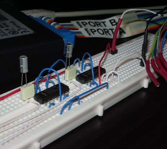 Non disponendo di porte NOT utilizzo le NAND, la sostanza non cambia! Ecco il circuito su BreadBoard con 2 CD4011: