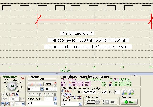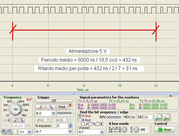 Notiamo che il ritardo è inferiore a quanto ci si aspettasse, ma il DataSheet specifica bene che i dati ivi riportati si riferiscono ad un carico di 200 kΩ con capacità 50 pF, mentre il nostro unico carico è rappresentato dall'oscilloscopio stesso e quindi le condizioni son ben diverse. Quindi a 5 V con 7 porte riusciamo ad avere un clock di circa 1 / 430 ns = 2,3 MHz.