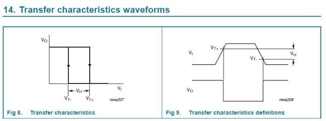 Qui si pone il problema di scegliere la porta NOT più adatta. Una normale porta NOT presenta lo svantaggio di mal tollerare ingressi a lenta variazione tipica delle fasi di carica e scarica del nostro circuito RC. Infatti qualunque tensione in ingresso compresa tra la VIL e la VIH determinano instabilità dell'uscita, insomma la porta non "capisce" se l'ingresso ha valore logico 0 o 1 e quindi non "sa" cosa produrre in uscita. Per ovviare all'analogo problema che si riscontrava in elettronica analogica, nel lontano 1934, l'allora studente Otto H. Schmitt inventò il dispositivo che ha preso il suo nome: Trigger di Schmitt. Le porte logiche che adottano tale dispositivo sono in grado di trasformare un segnale d'ingresso lento, come lo è appunto quello del nostro condensatore, in un segnale in uscita ben definito e privo di jitter. Questo grazie al fatto che hanno due soglie di tensioni in ingresso sulle quali scattano (trigger = grilletto, scatto, sgancio) invertendo l'uscita solo al superamento di tali soglie. Vediamo uno schema di tali soglie da un generico datasheet di una generica porta NOT Schmitt-Trigger: