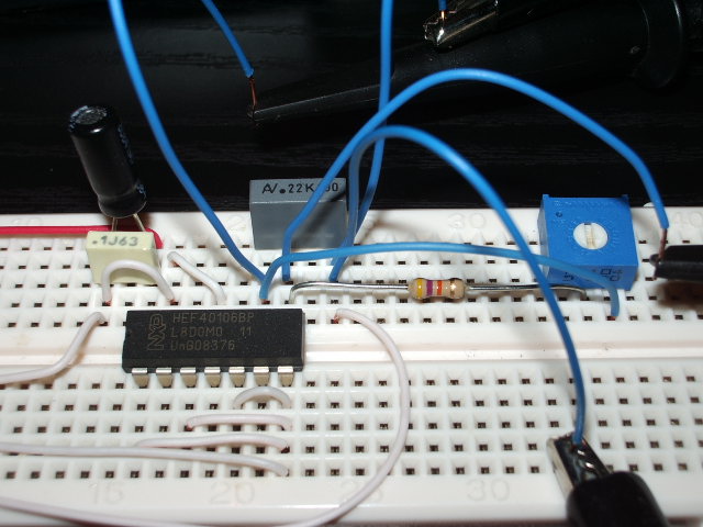 Allora non ci resta che sperimentare il circuito su BreadBoard. Dispongo di un CD40106 e questo uso: