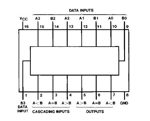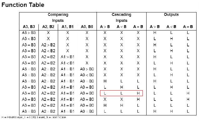 Individuiamo i due ingressi da confrontare A (A3-A0) e B (B3-B0), quindi le tre uscite sui pin 5, 6 e 7. Vi sono altri tre input detti Cascading Inputs che servono nel caso si voglia confrontare grandezze su più di 4 bit: basterà collegare due o più integrati ponendo le uscite OUTPUTS dell’integrato che confronta i bit meno significativi agli ingressi CASCADING INPUTS dell’integrato che opera sui bit più significativi. Nel nostro caso di integrato singolo dovremo porre ad High il pin 3 e a Low i pin 2 e 4 come evidenziato nella Function Table:
