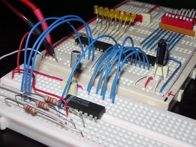 Bene, non ci resta che montare l’integrato sulla Bread Board e collegare il Logic Switch & Indicator ricordando di porre tre resistori da 8,2 kΩ tra le uscite del comparatore ed il Logic Indicator per limitare la corrente IOH: