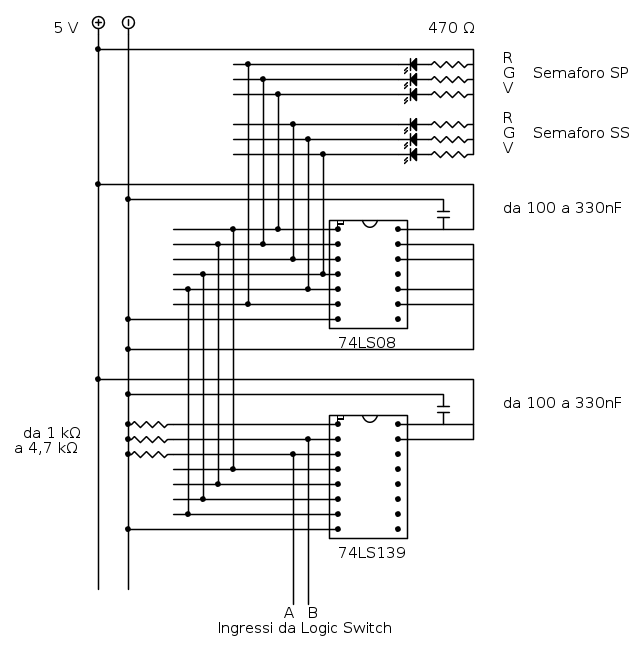 - il Rosso di SS vale zero (cioè si deve accendere) in corrispondenza di A e B;