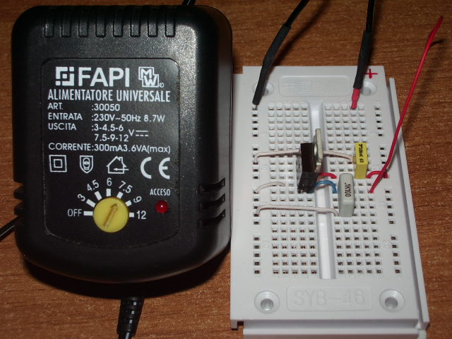 A questo punto ci basta reperire una basetta, montarci l'LM7805, collegare i 2 condensatori consigliati ed abbiamo un ottimo generatore di tensione a 5 V: