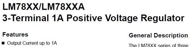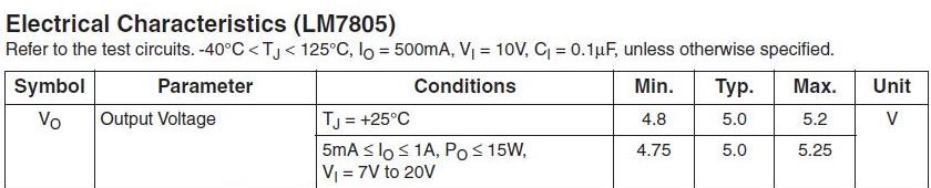 Un alimentatore da quattro soldi non fornisce una buona tensione stabilizzata sul valore nominale, ne a vuoto ne sotto carico, quindi, anche disponendo di un trasformatore con tensione nominale di 5 V non saremo mai sicuri della effettiva tensione fornita. Vale la pena, allora, adottare un regolatore di tensione come l'LM7805. Come di consueto reperiamo il suo datasheet e lo analizziamo.