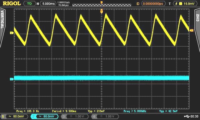 dove il segnale giallo si riferisce alla tensione in ingresso all'LM7805 e quello in blu alla tensione in uscita.